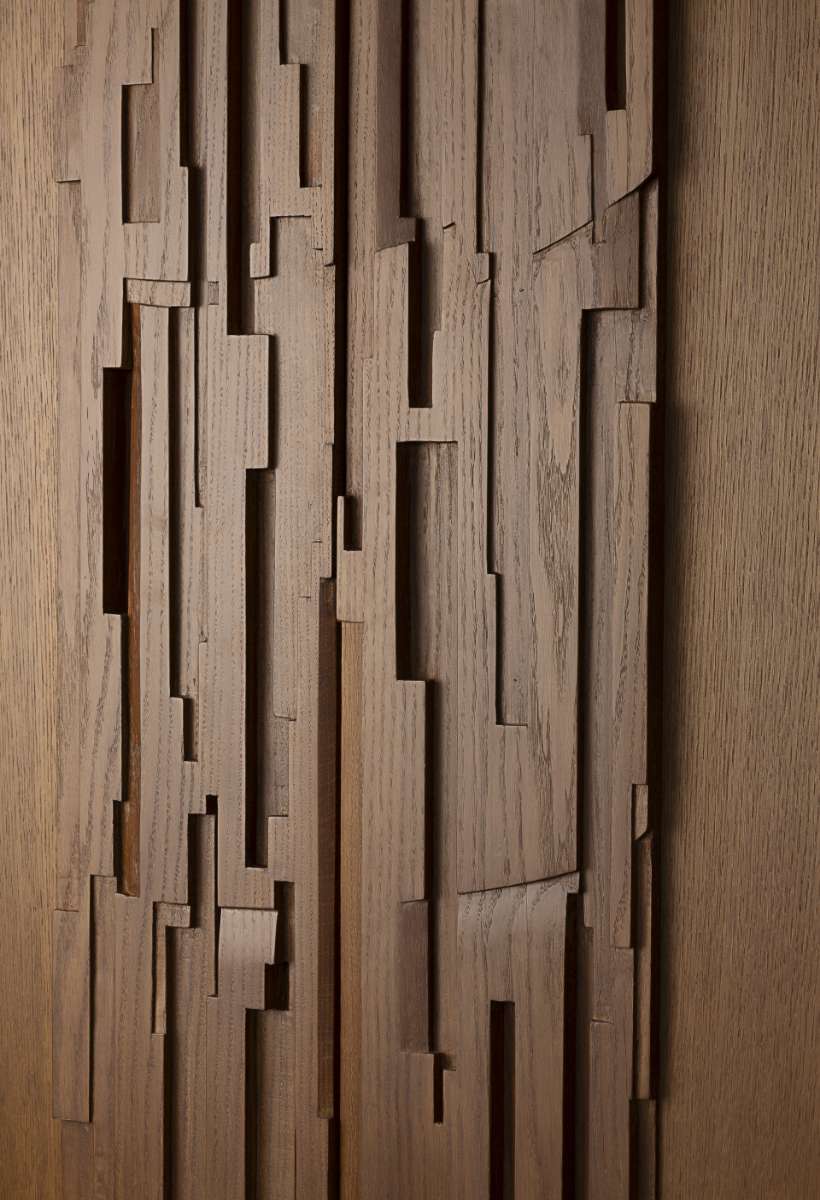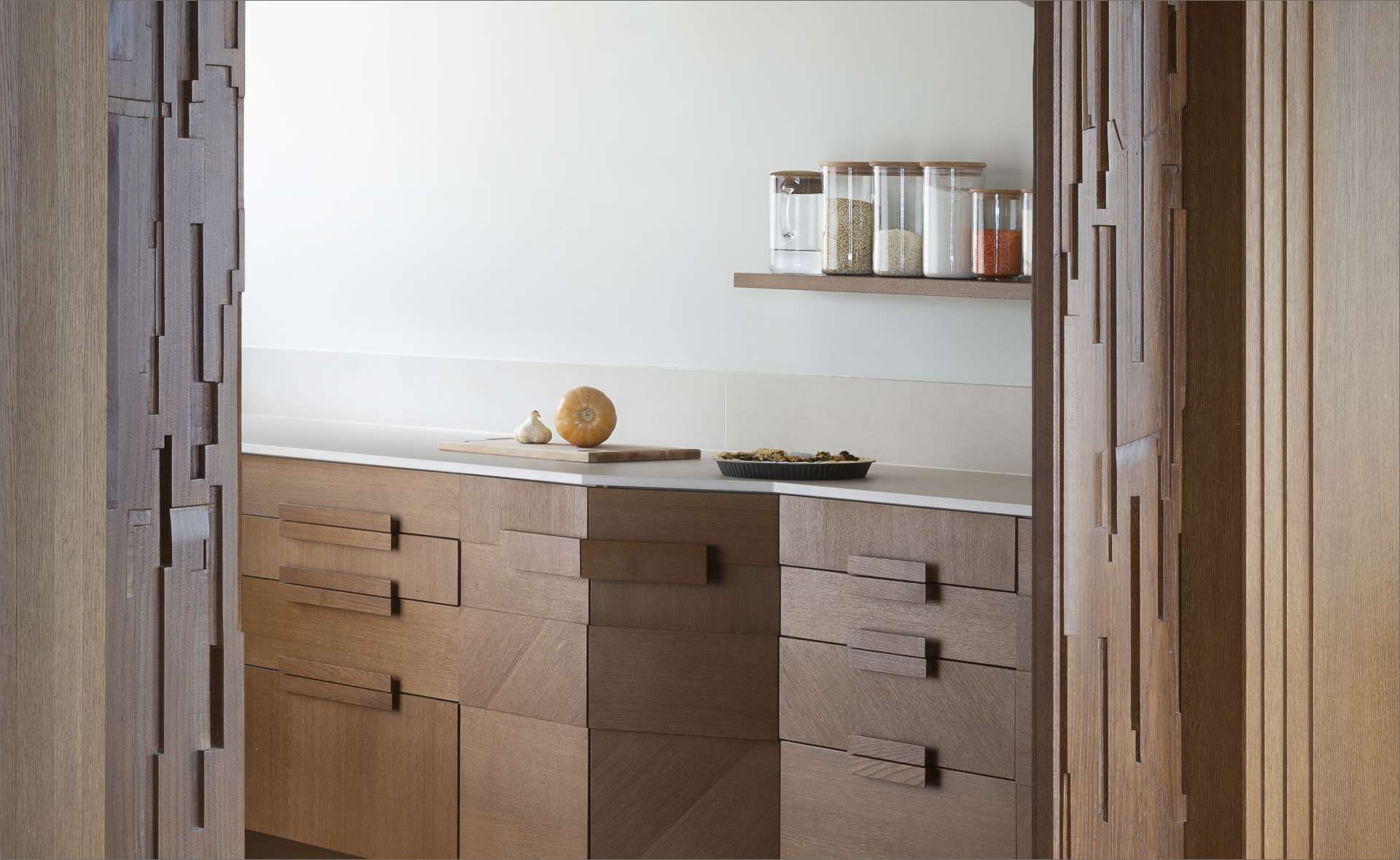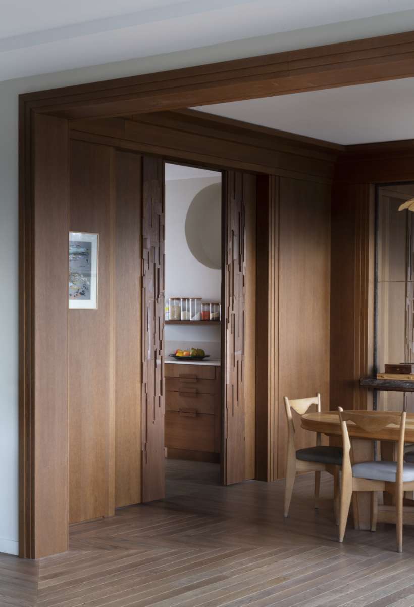 Chaque élément a été pensé sur mesure, dans une approche globale du design intérieur : du dessin des parquets au motif géométrique des façades, jusqu’aux luminaires créés spécialement pour l’espace. Les rythmes des façades dialoguent avec la lumière, apportant à la pièce une vibration douce et chaleureuse. La porte coulissante, sculptée par l’artiste Vincent Laval, vient enrichir l’ensemble d’une présence artistique subtile.